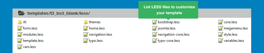 T3開發(fā)的少。當(dāng)自定義您的網(wǎng)站時(shí),我們建議您使用更少的文件。較少的文件將被編譯后的CSS文件。所有的小文件定制位于模板/ t3_bs3_blank /less。