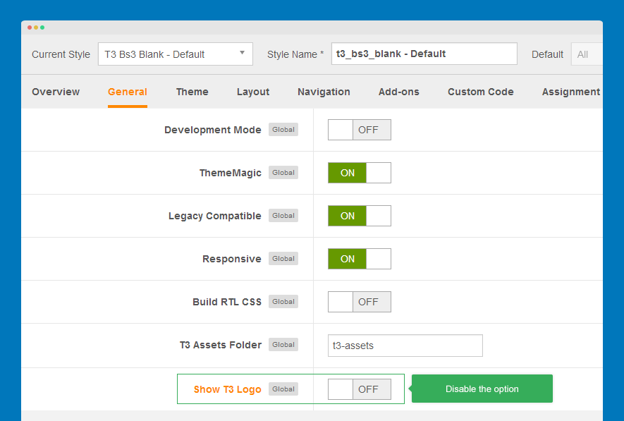 您可以添加無限的參數,主題定制組。定制的參數設置在文件夾中的文件thememagic.xml:templates/t3_bs3_blank