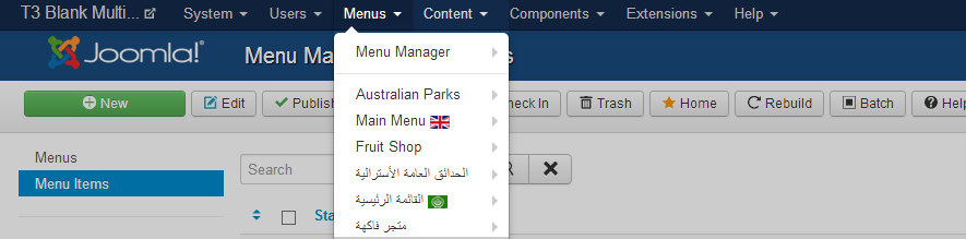 對于每種語言,您需要創建一個基于默認語言菜單系統的菜單系統.。例如,你的網站是目前2種語言:英語和阿拉伯語。那么你應該創建基于現有阿拉伯語英語菜單菜單。