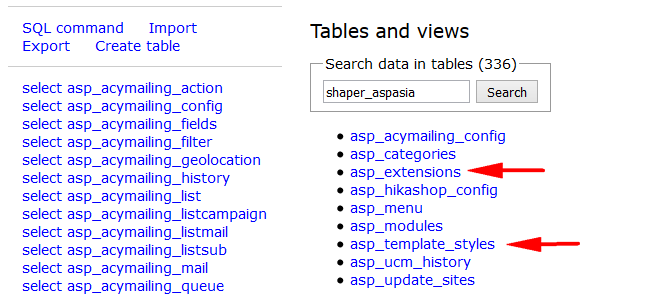5.現在你要使用MySQL的經理,在大多數情況下,你會在你的主機面板上找到一個。使用搜索選項找到“shaper_aspasia”: