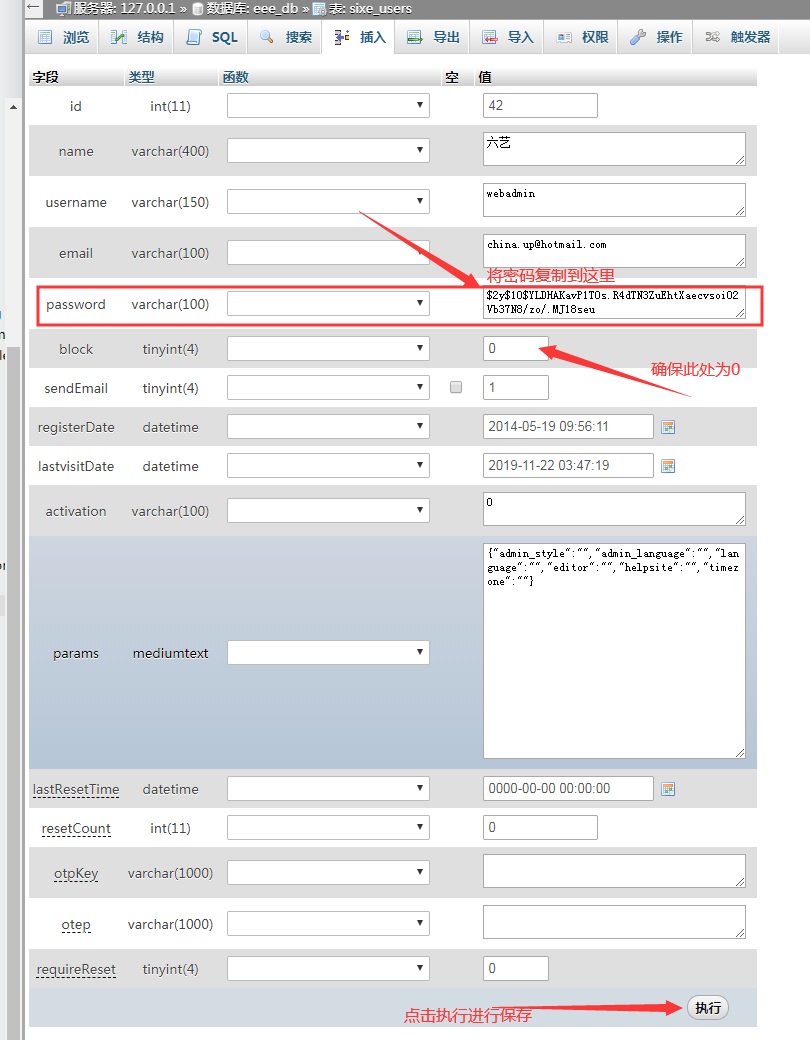3.可以看到該用戶的所有信息,在【密碼password】中有一段很長的加密字符串,刪除該字符串,將下面的字串復制到此字段將密碼設置為testadmin