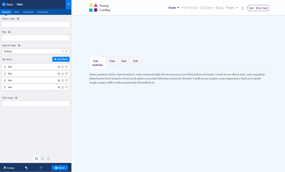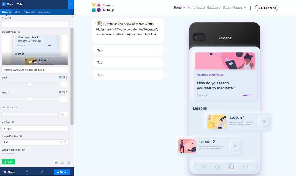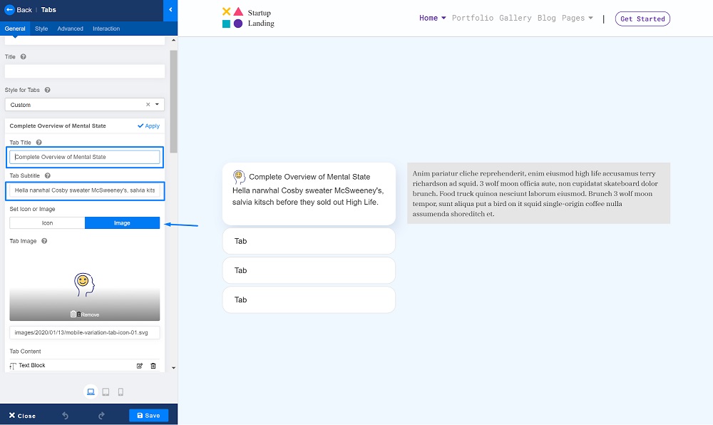 現在,讓我們添加我們的標簽內容。最好的部分是您可以使用任何您喜歡的插件為每個選項卡項目制作您的內容。我們如何添加 Image 插件來讓我們的標簽更具吸引力?