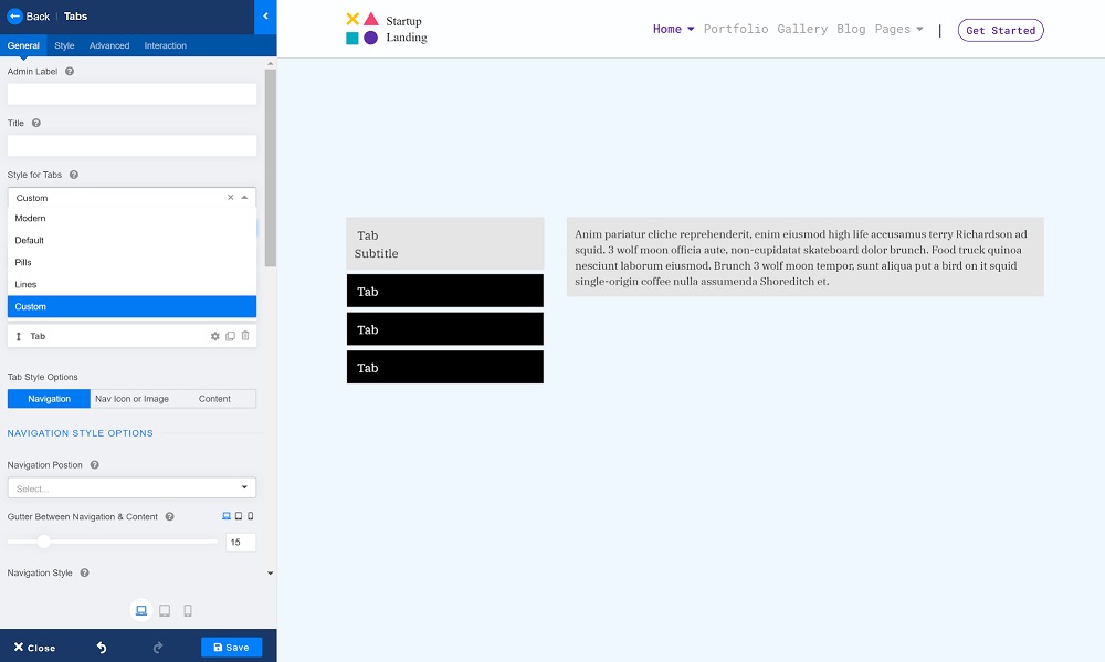 選項卡插件讓您可以選擇選項卡樣式,通過簡單直觀的界面創建漂亮的響應式選項卡。您可以從 Modern、Default、Pills、Lines 和 Custom 中進行選擇。它們都有自己的用途,但在本教程中,讓我們使用自定義樣式。