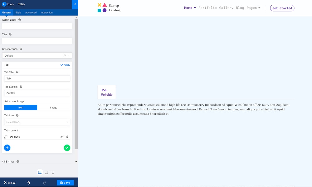 一旦你有了基本的結構,就該添加內容了。只需在各自的字段中鍵入標題和副標題,即可為您的選項卡模塊提供標題和副標題。您還可以從圖標列表中設置一個圖標或使用唯一的圖像作為圖標,如下所示。
