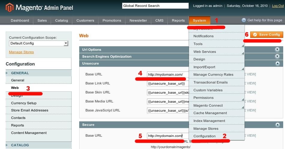 如果Magento服務器更換IP地址,或者進行服務器遷移,需要更改Magento基本URL,你要登錄Magento管理后臺,找到System > Configuration > Web > Unsecure > Base URL and System > Configuration > Web > Secure > Base URL.