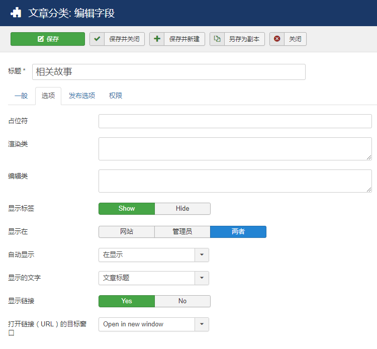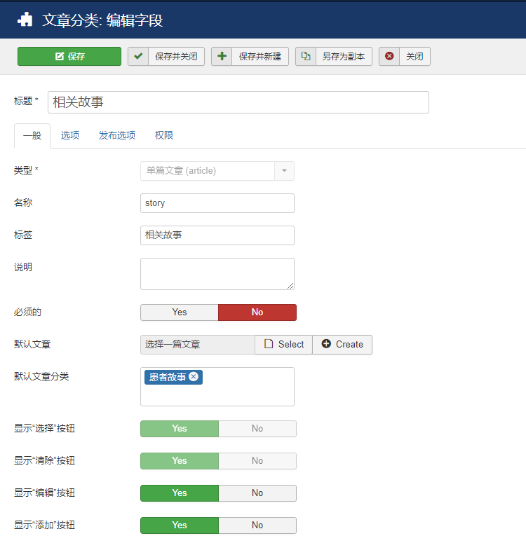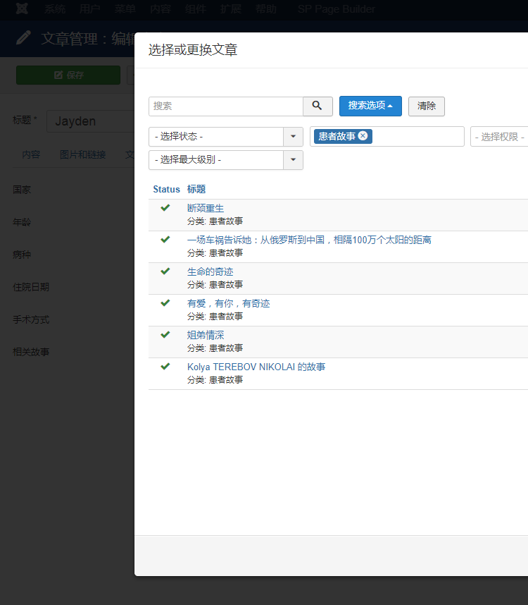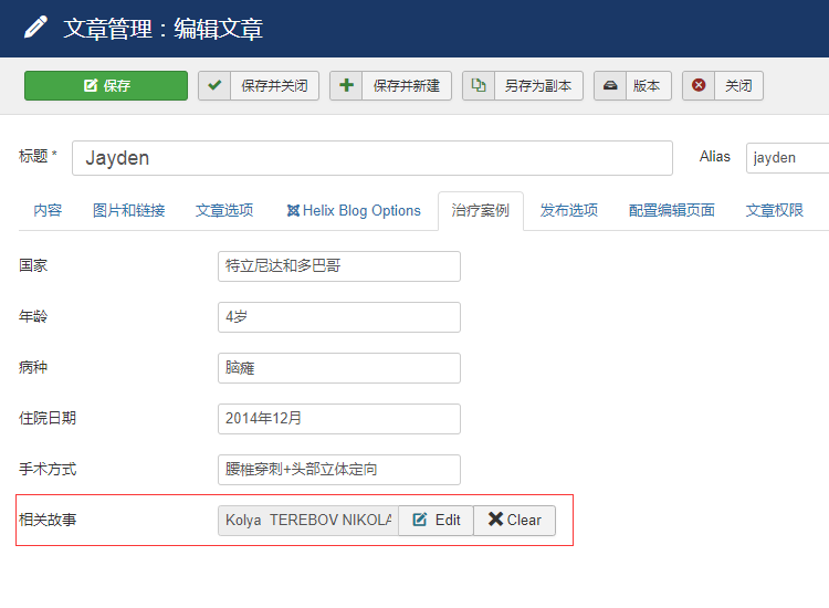 比如你要策劃的網站,需要有個欄目來介紹一些病種案例,需要詳細地介紹此人的性別、年齡、所患病種等等,分開這類屬性信息便于前臺更靈活地輸出,通常我們采用joomla自定義擴展字段功能來處理。現在我們需要另外一個需求,需要介紹此病人抗擊病魔的感人故事,而他的故事文章已作為另外一個分類下的文章被規劃,這樣我們就需要在這兩篇文章之間建立關聯關系。通常我們可以添加個擴展字段,用來輸入另外一篇文章的ID,這是一個解決方案,但這要求網站編輯人員要了解什么是文章ID,而且找到另外這篇相關的文章需要好幾步驟操作,這給網站的維護工作帶來了極大的不便,降低了網站編輯人員的工作效率。